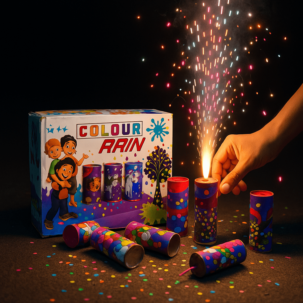 పలురంగుల స్ఫులింగాలు వానలా జారిపడే కలర్ రేన్ మినీ ఫౌంటెన్. వెలిగిన వెంటనే ఎరుపు/ఆకుపచ్చ/నీలం/పింక్ తుంపర్లు కురుస్తూ లైట్ క్రాక్లింగ్‌తో 6–10 అడుగుల వరకు ఎగసే అందమైన షవర్ ఇవ్వుతుంది. ఇంటి ప్రాంగణం, గేట్స్ వద్ద చిన్న డిస్ప్లేలకు సూపర్. ప్యాక్‌లో బహుళ పీసులు ఉంటాయి (బ్రాండ్‌పై ఆధారితం).